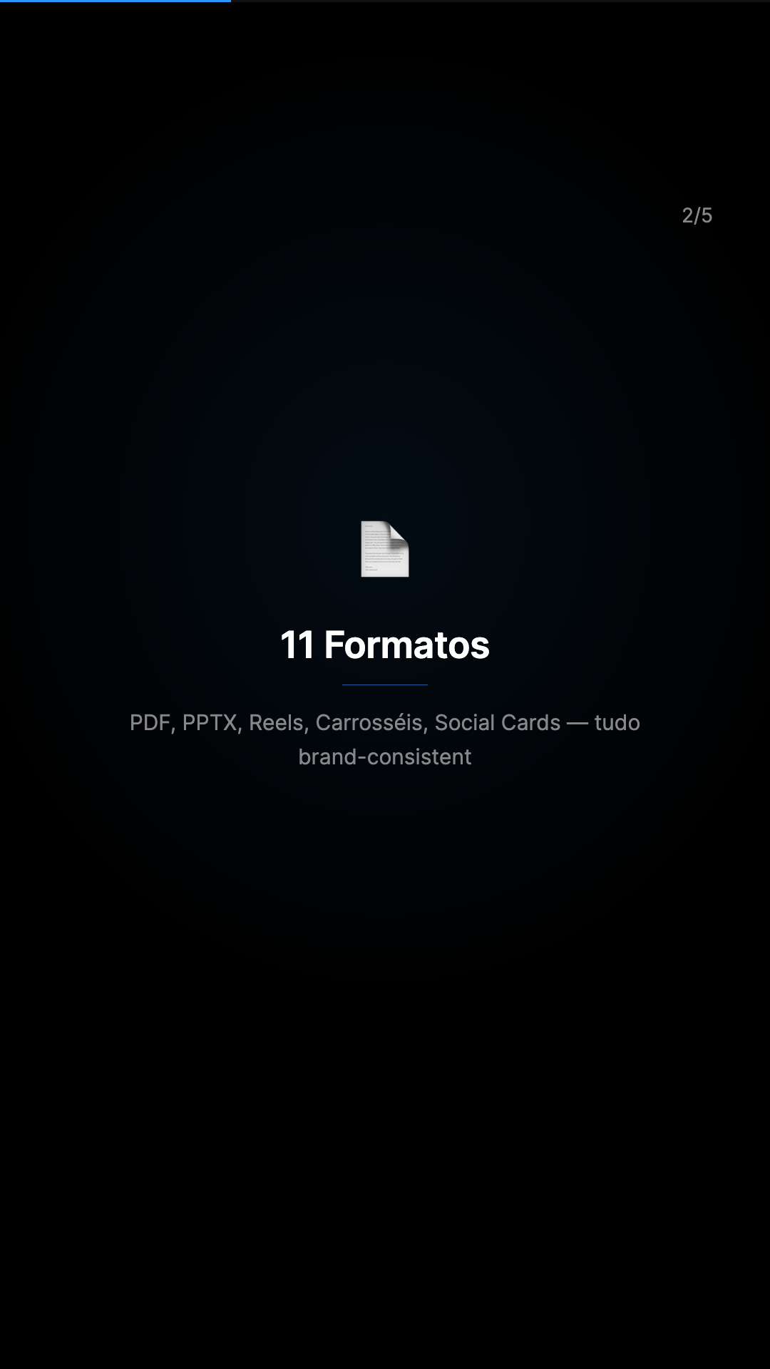 PDFs. Apresentações. Reels. Carrosséis. Social Cards. Tudo perfeitamente alinhado com seu design system. Em minutos, não em dias.