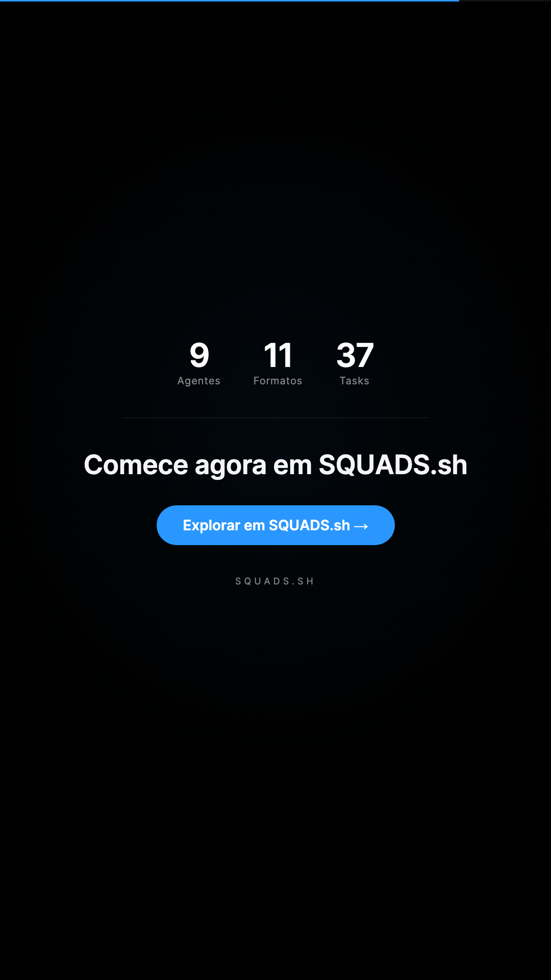9 agentes. 37 tasks. 5 workflows. 4 checklists. 11 formatos. Qualidade garantida.